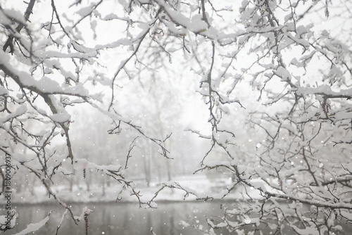 Tree branches covered in snow in a winter park, nature background, seasonal backdrop photo