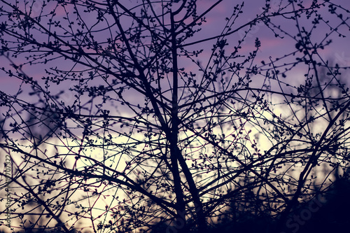 Tree branches on evening sky background in spring garden.