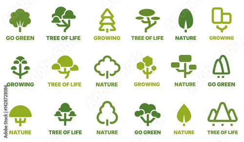 Tree business logo. Oak and pines silhouette emblem, abstract tree growth nature forest business icons, simple green leaf badge for park garden label. Vector green trees set
