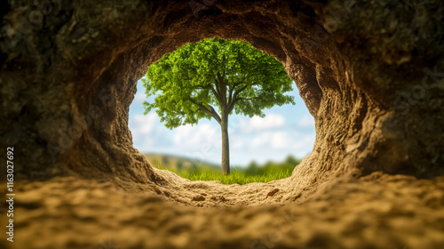 Tree growing from soil framing cave entrance on sunny day