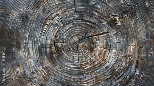 Tree Ring Texture of Old Wood. A distinctively aged, weathered, and worn piece of wood with outstanding intricate grain and cracked rings. Generative AI