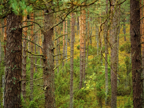 tree trunk in a deep moody forest in autumn season in a rainy day. wild nature background