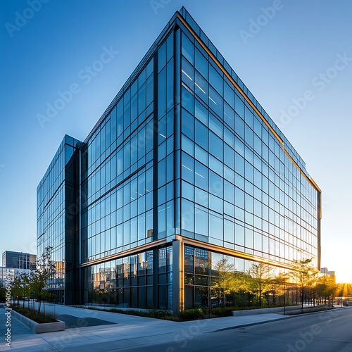 Trees surrounding reflective modern building at golden hour high resolution picture