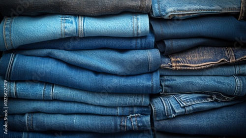 Trendy jeans folded in layers, creating a beautiful display in a denim store.