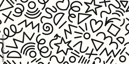 Trendy Memphis geometric seamless pattern. Cool abstract background in retro 80s, 90s style. Cute kid doodle design. Modern basic shapes set: star, arrow, triangle, circle, heart, zigzag, spiral, wavy