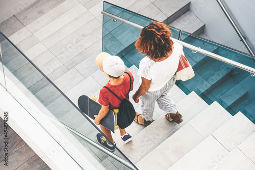 Trendy mother and son walking on stairs in a modern city context. Young boy with skateboard goes down the ladder with mum Top view of people walks in a mall. Family scene at the shopping center