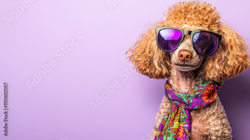 Trendy poodle wearing oversized sunglasses and colorful scarf, posing confidently