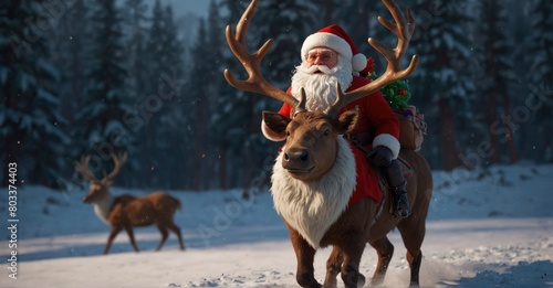 Trendy Santa sporting red beanie and sunglasses, riding sleek reindeer with colorful saddle.