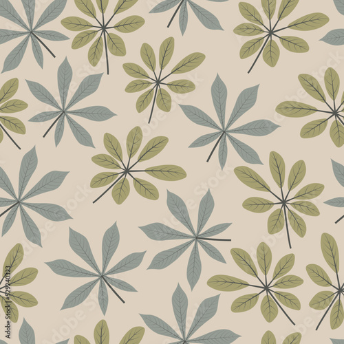 Trendy seamless ditsy pattern design of tropical schefflera leaves and cassava leaves. Artistic vector foliage background for printing & textile