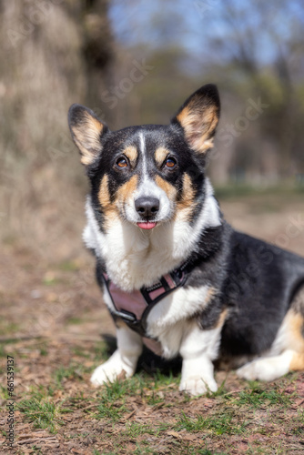 Tri colored Pembroke Welsh corgi sitting outside in a park with her tongue out wearing a harness. Toronto Canada