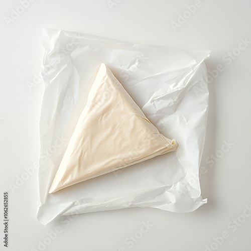 Triangle of cream cheese wrapped in parchment paper on white background.