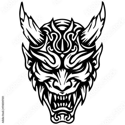 Tribal Demon Mask Vector Illustration – Evil Oni Face Tattoo Design in Black and White