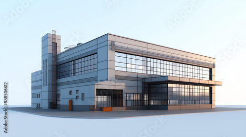 Trójwymiarowy model nowoczesnego budynku przemysłowego, zaprojektowany z myślą o efektywności i funkcjonalności.