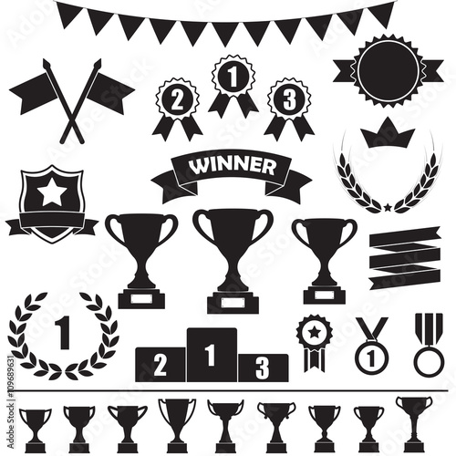 Trophy and awards icon set: laurel wreath, winning trophy cup, crown, medals, pedestal, flags, ribbons. Vector illustration isolated on white background.