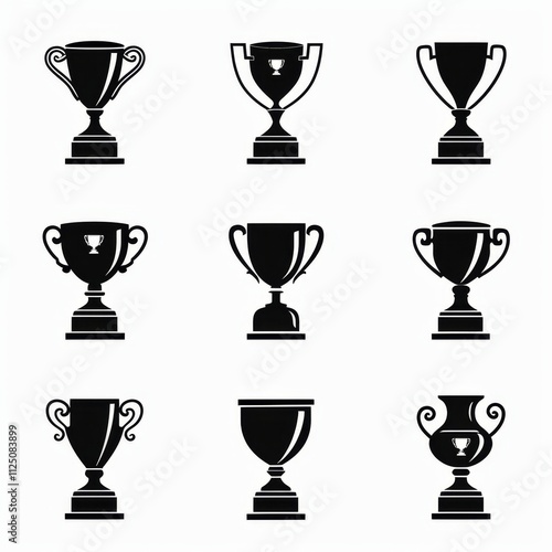 Trophy cups, golden goblet, silver reward, champion bowls. Contest winner award collection, prize cup