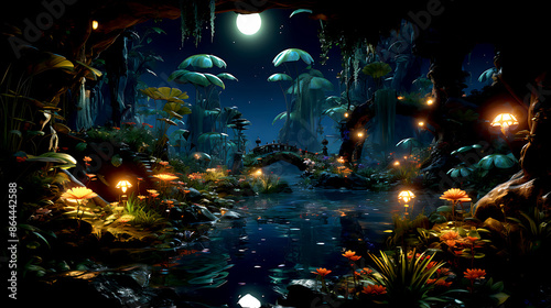 Tropical and exotic night forest,Fairytale forest with mystical magic lights reflected water. Living greenery of the forest.Unreal world