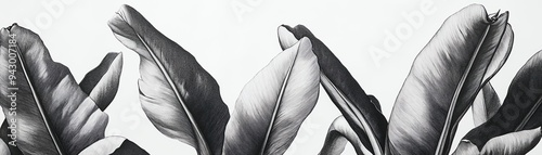 Tropical banana plants, botanical illustration, black and white, closeup, detailed shading, vertical composition