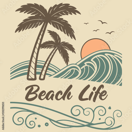 Tropical Beach Life Illustration With Palm Trees Waves And Sunset Vector Design