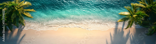 Tropical Beach Paradise, Overhead View of Turquoise Water, Soft Sand, and Lush Palm Trees Casting Shadows on the Shore.
