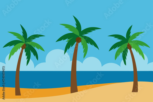 Tropical Beach Paradise Three Palm Trees on Sandy Shore, Sunny Sky