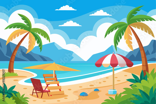 Tropical Beach Scene with Palm Trees, Umbrellas, and Beach Chairs