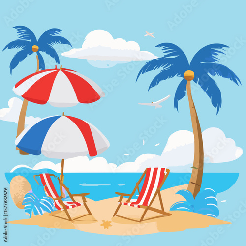 Tropical Beach Vector Illustration with Palm Trees, Umbrellas, and Lounge Chairs