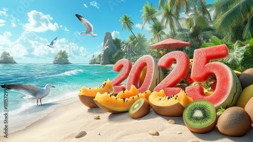 Tropical Beach with 2025 Shaped from Fruits