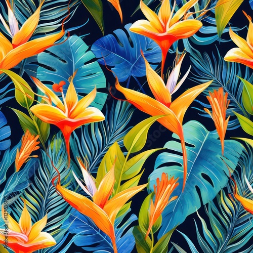 Tropical Flowers and Leaves on Dark Background