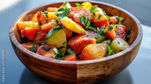 Tropical fruit salad delight wooden bowl food photography soft lighting top-down view vibrant colors and textures