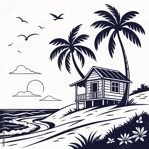 Tropical hut on beach with palm trees and waves, silhouette vector art