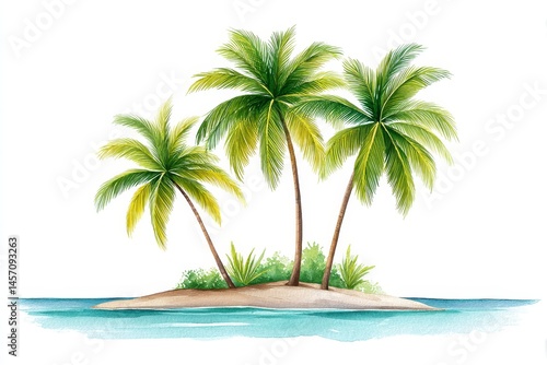 Tropical Island Paradise - Three palm trees on a small sandy island in turquoise water. Perfect for travel, vacation, and summer themes