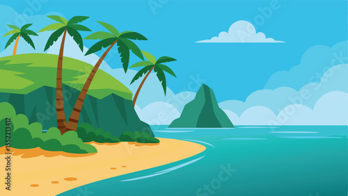 Tropical island scene with palm trees sandy beach and calm blue ocean scenery