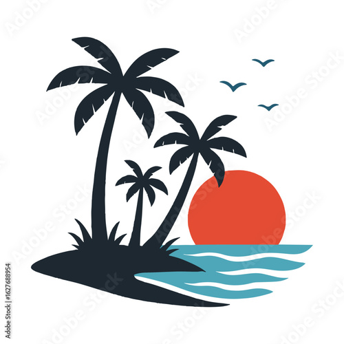 Tropical island sunset with palm trees, ocean, and birds vector illustration