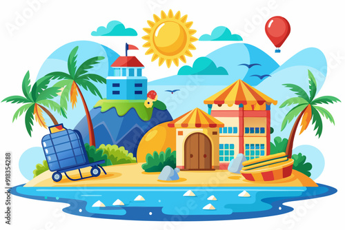 Tropical Island Vacation Destination with Buildings, Palm Trees, and a Hot Air Balloon
