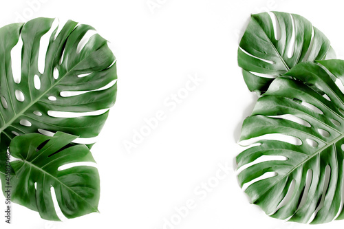 Tropical palm leaves Monstera on white background. Flat lay, top view.