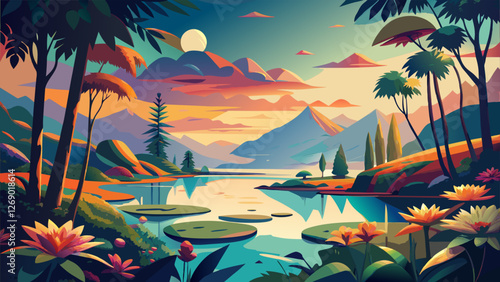 Tropical paradise with lush greenery and a tranquil lake reflecting the sunset.