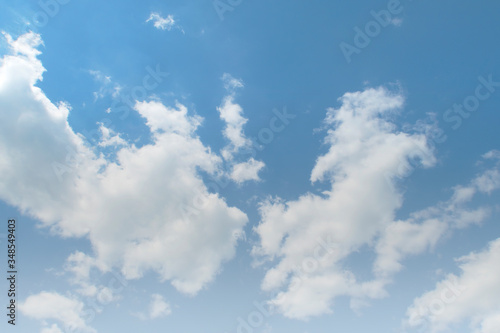 Tropical summer bright blue sky background with white puffy fluffy cumulus clouds & cotton candy cloudscape in beautiful warm weather & sunny morning sunlight on daylight horizon at sunshine day
