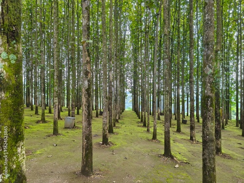 Symmetrical teak tree plantation with mossy ground in a tropical forest. Natural, serene landscape perfect for themes
