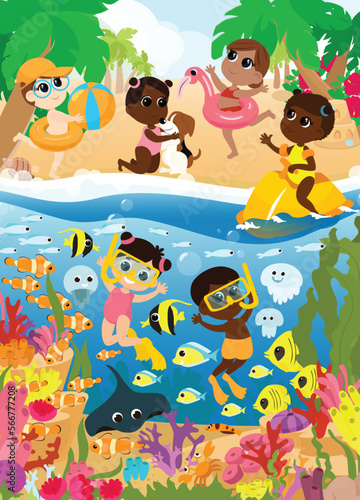 Tropical underwater world of corals and sea fishes and sea shore. Children play on the shore and swim underwater. Picture for children's puzzles.