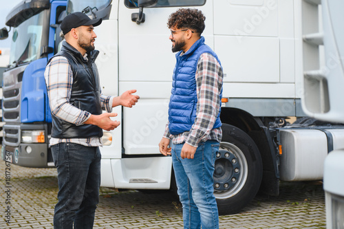 Truck drivers discussing logistics and transport business