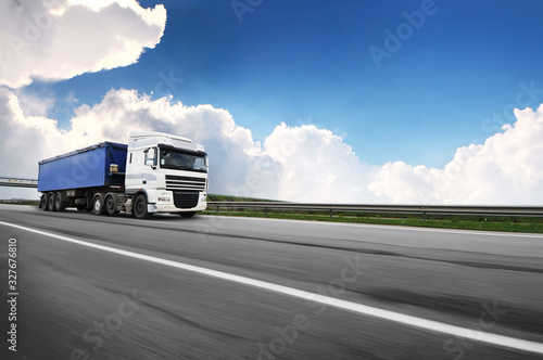 Truck with a trailer in motion on the countryside road against sky with clouds