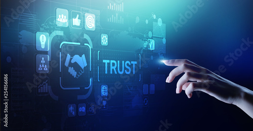 Trust customer relations reliability business concept. Pointing and pressing on virtual screen.