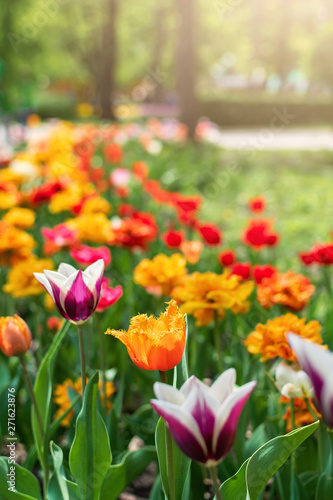 Tulips in spring closeup. Colorful tulips in the flower garden, arboretum. Flower bed in the park