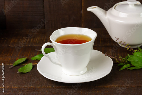 Tulsi or holy basil tea in white cup with fresh tulsi leaf on wooden background. Ayurvedic medicine in India.