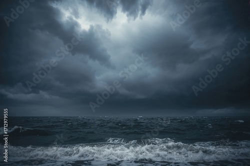 Turbulent waters beneath a brooding sky. Storm clouds gather above the shadowy sea. A powerful natural scene filled with foreboding atmosphere.