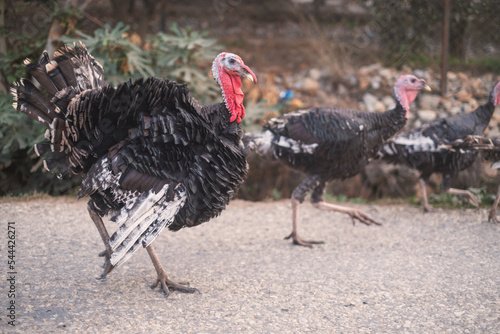 Turkey birds walking around the village. Meleagris gallopavo