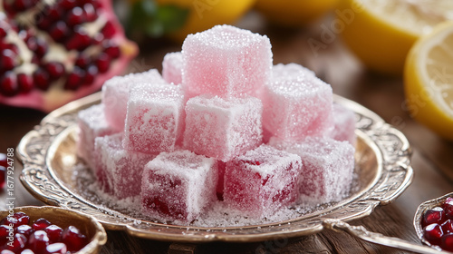 Turkish Delight with Powdered Sugar, Lemon and Pomegranate on Wooden Table