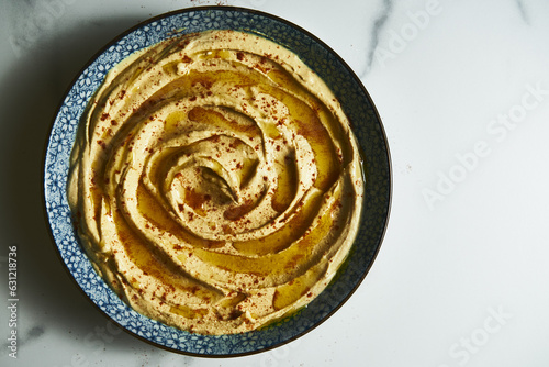 Turkish hummus close up. Creamy dip made from chickpeas, tahini, olive oil, lemon juice, and garlic. Include yogurt or butter for extra richness.