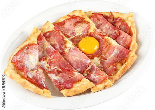 Turkish traditional Karadeniz pide with beef bacon. Pastirmali pide. Isolated on white background transparent png image