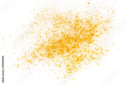 Turmeric (Curcuma) powder pile isolated on white background, top view